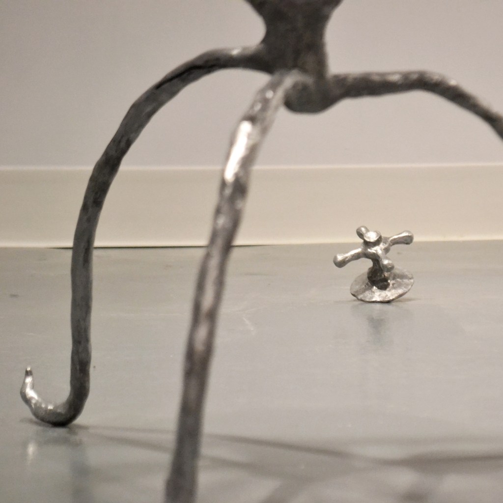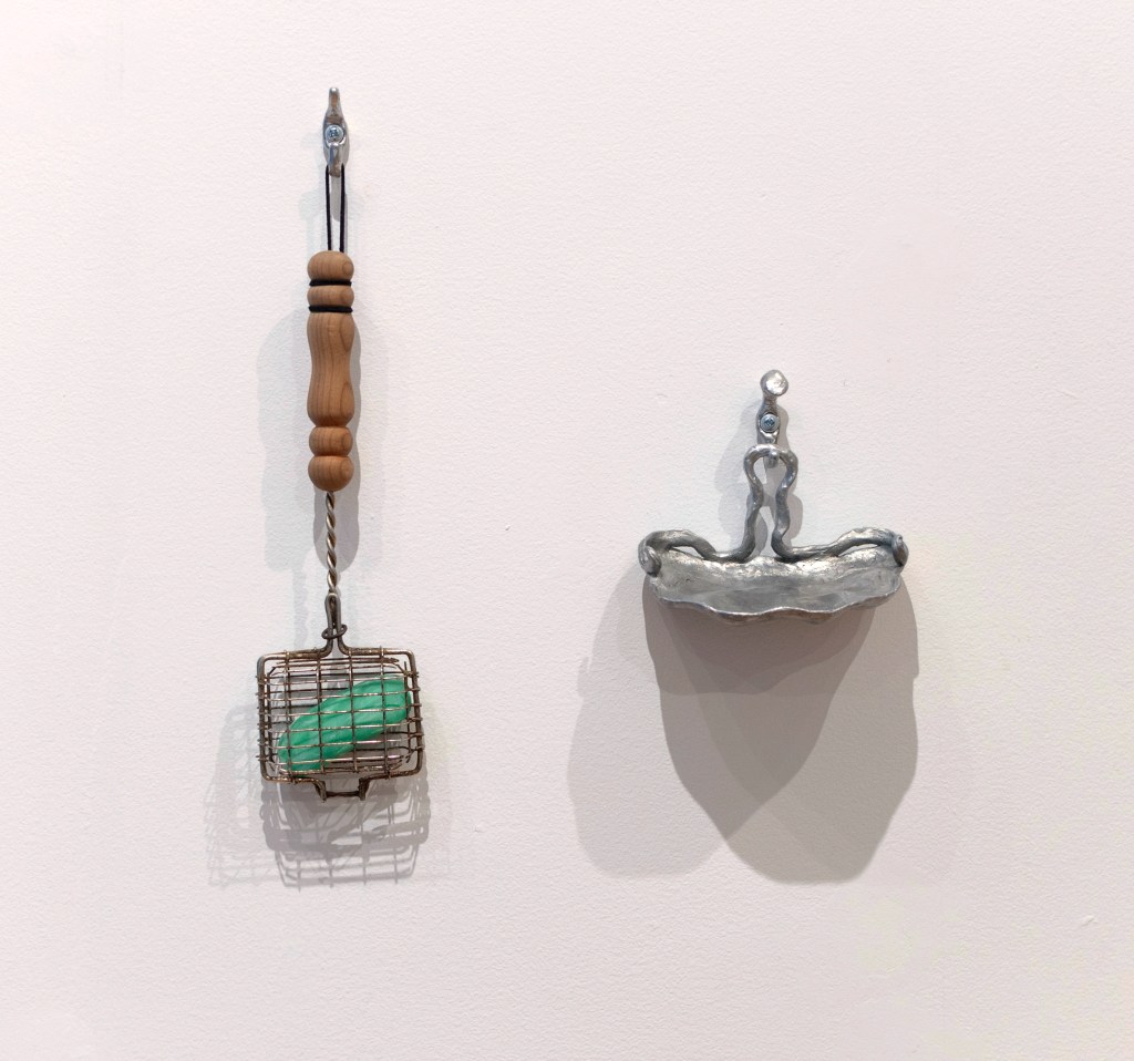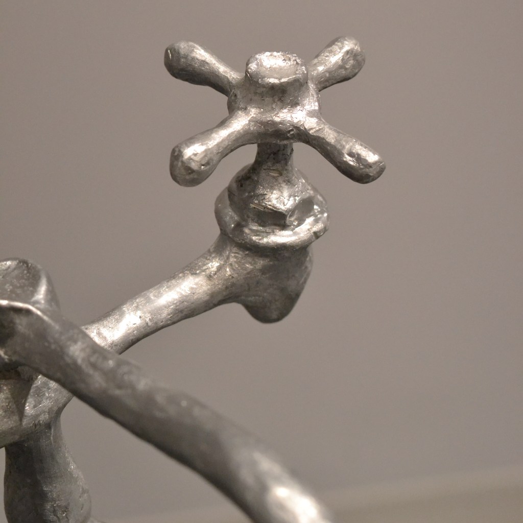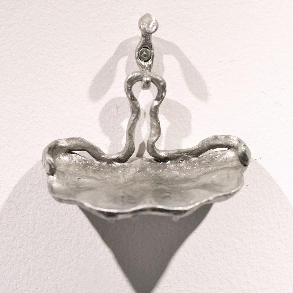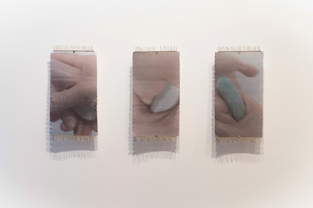 Entre l’enlacement et l’entrelacement est une continuation de l’exploration par l’artiste de l’espace de la salle de bain comme omniprésence ; un espace tangible, un portail de l’intime. Ici, l’utilitaire lui-même devient un personnage de la scène, suivant l’idée que l’espace habité devient corps. Les objets transcendent leur usage habituel, les sortant de leur nature pratique et mettant en valeur leur qualité et leur matérialité inhérentes. Clara-Jane s’inspire notamment du concept d’usage queer/oblique développé par Sara Ahmed, qui explique que lorsque des choses sont détournées de leur usage initial, leurs qualités et propriétés ne disparaissent pas ; au contraire, ces usages alternatifs peuvent mettre en valeur ces caractéristiques, les rendant plus vivantes (Vandalisme queer, p.40). L’oeuvre présente également une série de tissages révélant des images tirées d’une performance vidéo où deux mains de personnes différentes se lavent mutuellement. Un geste pourtant si simple et familier, qui devient maladresse, ou peut-être même sensualité, là où ces deux mains étrangères s’entremêlent.