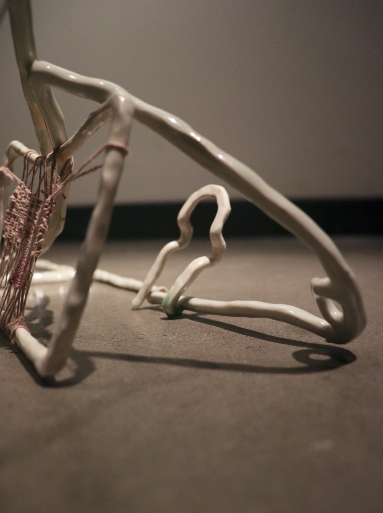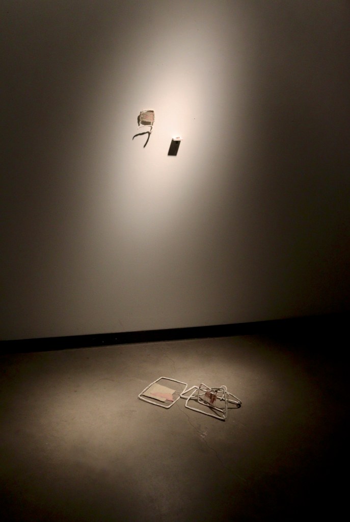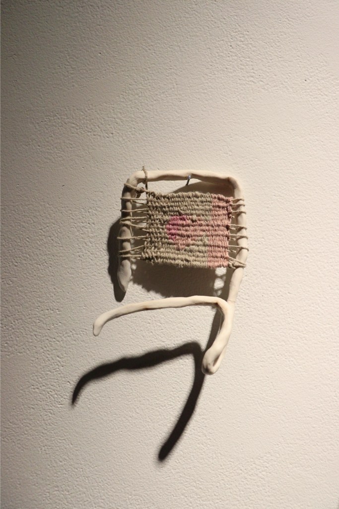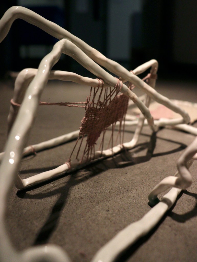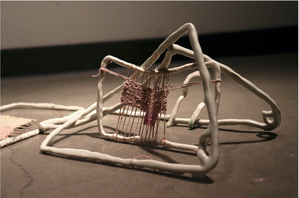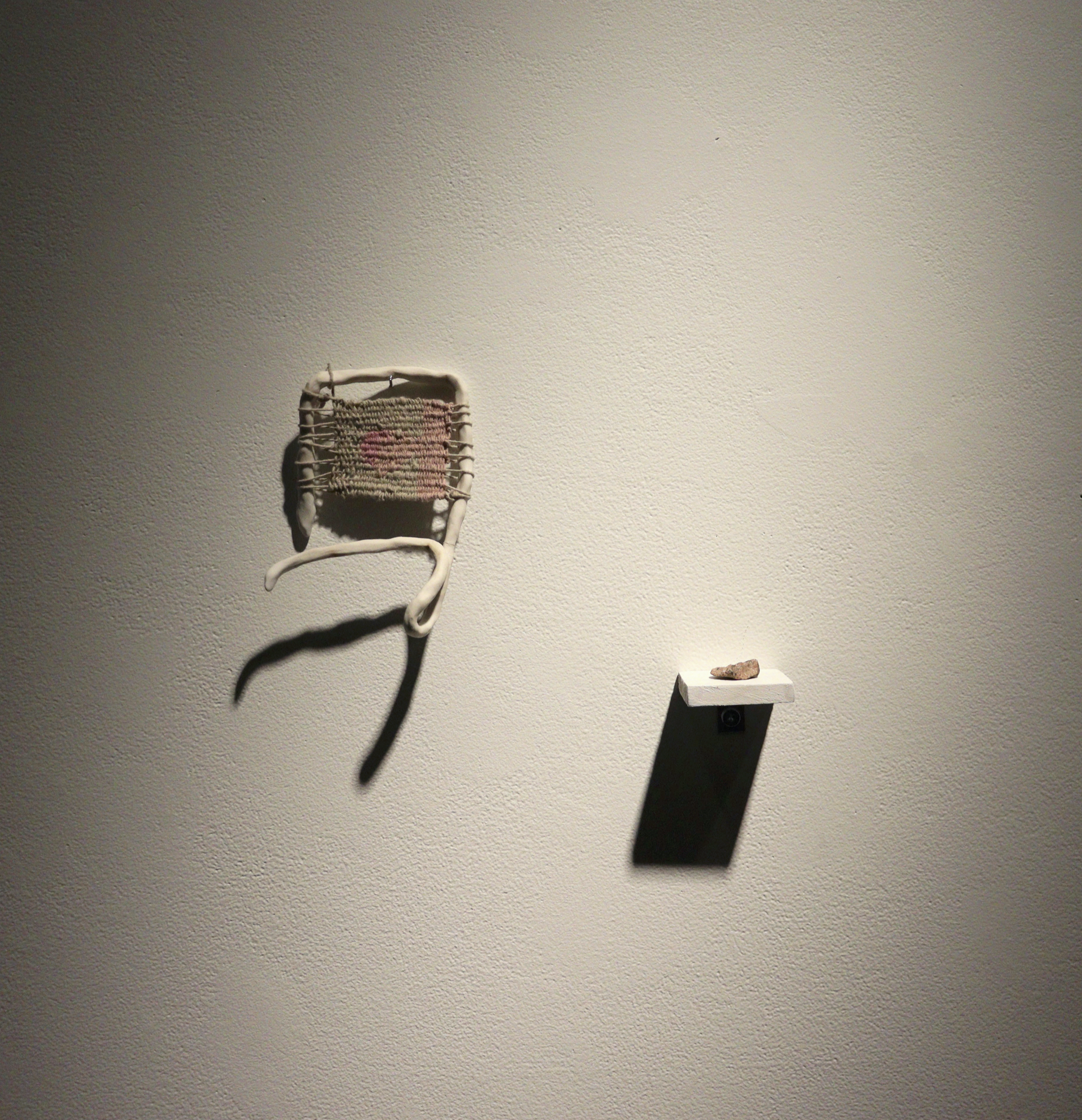 Cadres à tissage en céramique, fils de papier d’abaca teints [rudbeckia, cochenille, garance], roche récoltée sur les rives du fleuve Saint-Laurent