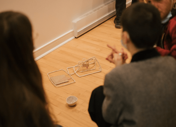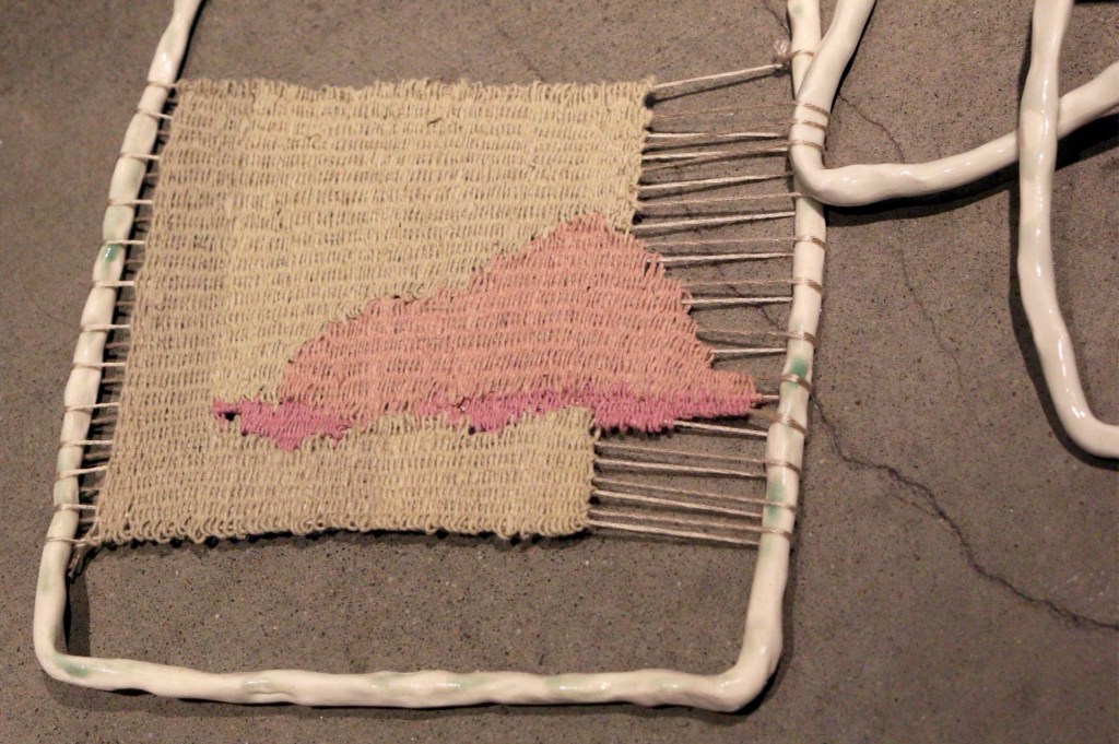 Ceramic weaving frames, dyed abaca paper yarns [rudbeckia, cochineal, madder], stone harvested on the shores of the St. Lawrence River