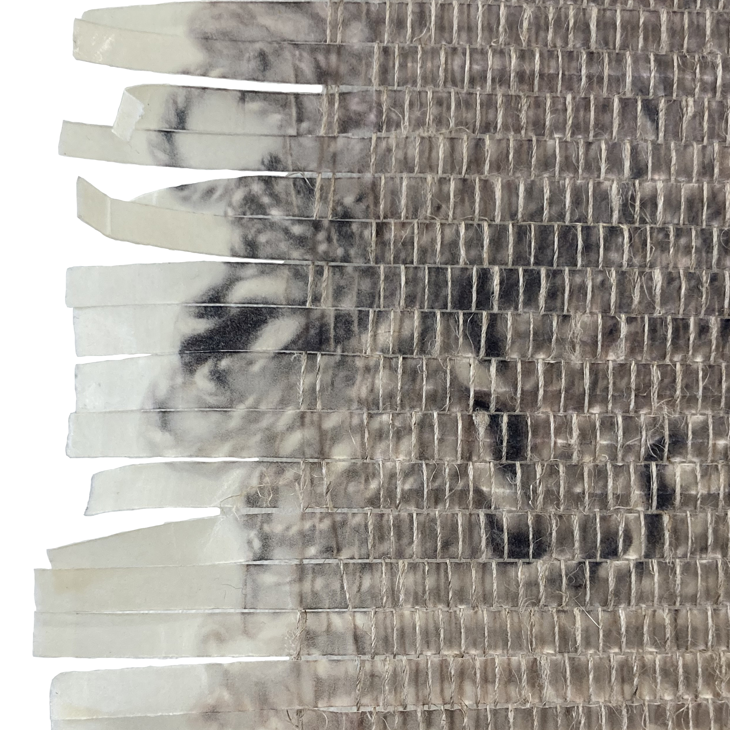 Intentional degradation of the image through repeated processes of scanning, printing, waxing, cutting, and weaving