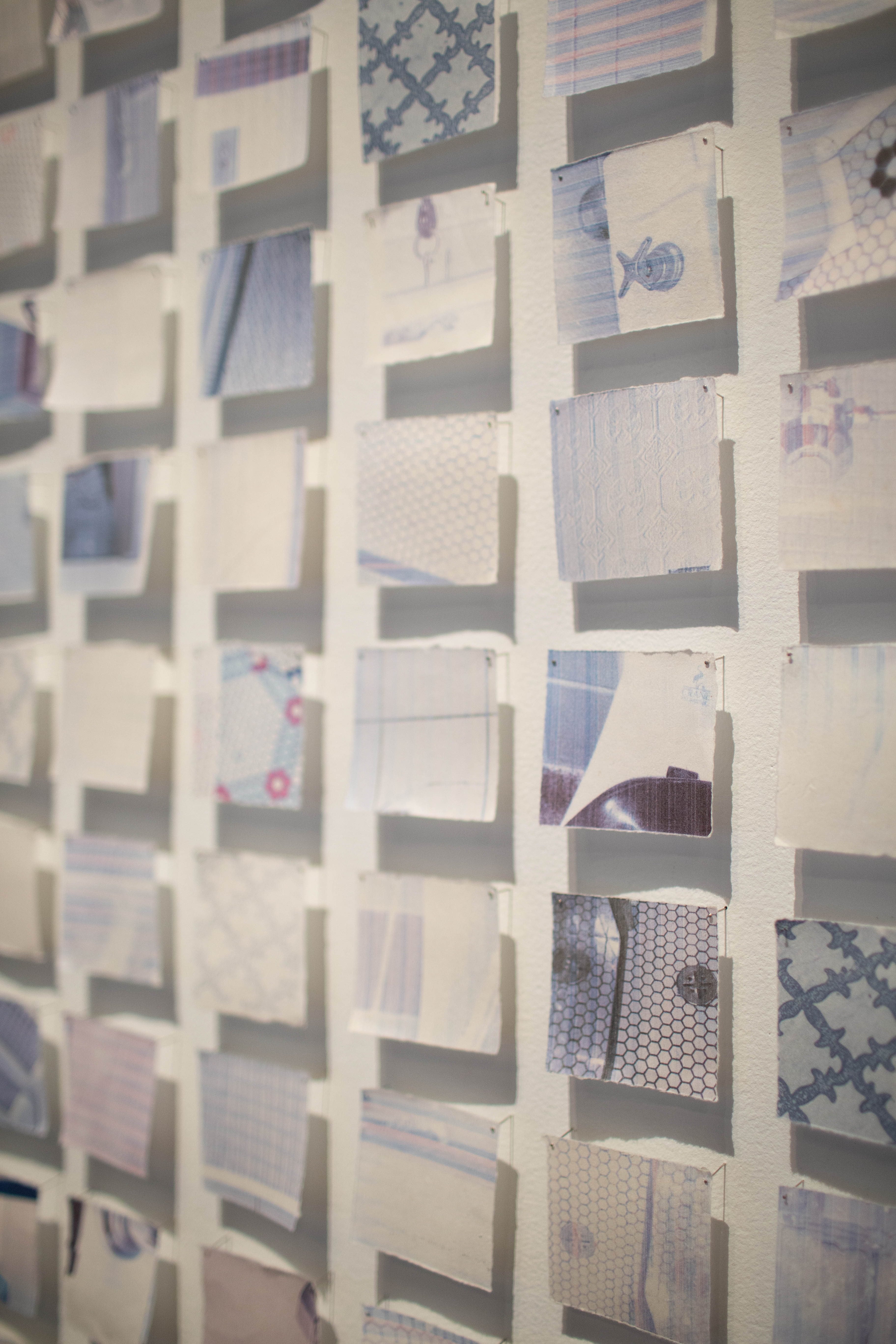 Pendant plusieurs mois, Clara-Jane a documenté les tuiles des salles de bains qui ont croisé son chemin, provenant autant de lieux publics que privés. Les photos se ressemblent dans leur forme, mais se différencient dans leur contenu, de par les histoires que ces carrelages contiennent et les espaces qu’ils délimitent. Clara-Jane a également recueilli des échantillons de papier de toilette dans chaque salle de bain, ces derniers ressemblant à de petites tuiles aux motifs embossés distinctifs. Ces échantillons ont été identifiés et classés par ordre alphabétique dans une petite boîte de cartes de visite, que le public est invité à parcourir. Le papier de toilette restant a été transformé en feuilles de papier sur lesquelles ont été imprimées toutes les images de carrelages accumulées. Ces images ont ensuite été photocopiées à plusieurs reprises, jusqu’à dégradation, puis découpées en carreaux pour créer cette toute nouvelle disposition.