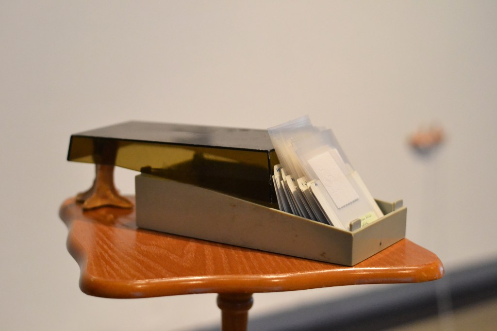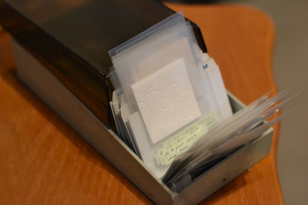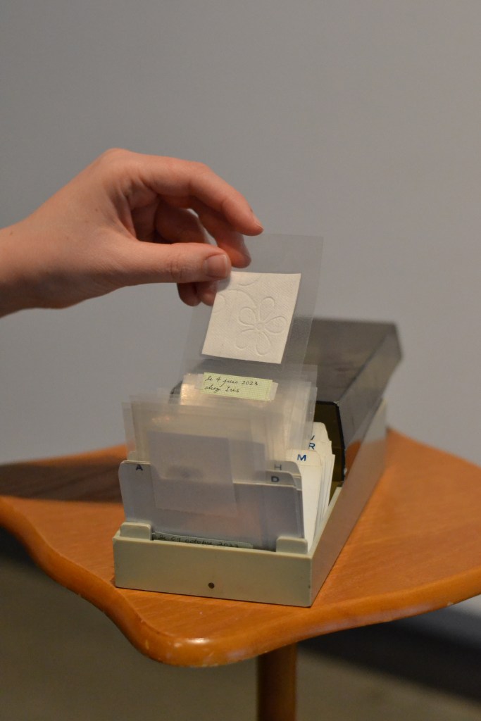 For months, Clara-Jane documented tiles from the bathrooms that crossed their path, from both public and private places. The photos are similar in form, but differ in content by the stories these tiles contain and the spaces they delimit. Clara-Jane also collected toilet paper samples in each bathroom, as it resembled little tiles with distinctive embossed patterns. The samples have been identified and organized in alphabetical order in a small business card box, which the audience is invited to browse. The remaining toilet paper has been made into paper sheets and used to print all the gathered tile images. These images have been then photocopied repeatedly until they degrade and cut into paper tiles to create this whole new layout.